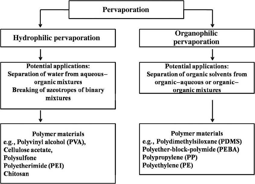 TheuseofPVfortheseparationofazeotropicmixturesis firstintroducedbyApteletal. [7] in1976andafterthatPVis potentiallyappliedfortheseparationofvariousliquidmixtures. However,theconceptofPVisfirstintroducedbyKober [8] in 1917fortheselectivepermeationofwaterfromaqueoussolutionsofalbuminandtoluenethroughcellulosenitratefilms.He observedthe“permselectiveevaporation”ofcomponents throughthemembraneandwasabbreviatedas“pervaporation.” ButthesystematicandpotentialapproachtowardPVwasfirst carriedoutbyBinningetal.fortheseparationofhydrocarbon mixturesthroughdensepolythenefilmsandobservedthatthe linearhydrocarbonspermeatefasterthanbranchedisomers [9,10].Thenalargenumberofhydrophilicandorganophilic membranesweredevelopedandextensivelyappliedforthe dehydrationoforganicsolventsandseparationoforganicsolvents,respectively.Polymeric-basedhydrophilicmembranesare widelyusedforthePVdehydrationoforganicsolventssuchas alcohols,ketones,acids,andethers [11].Polydimethylsiloxane (PDMS)-basedhydrophobicmembranesweredevelopedand usedfortheextractionoforganiccompoundsfromwatermixtures [12,13].GesellschaftfurTrenntechnikintroducedfirst commercializedPVmembranesbycoatingpoly(vinylalcohol) (PVA)onaporoussupportofpoly(acrylonitrile) [14]