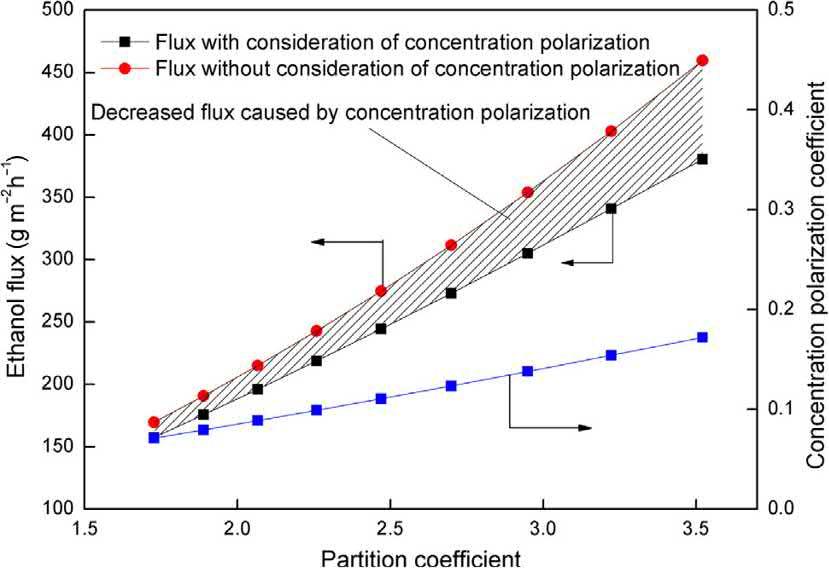 1.4.2Concentrationpolarizationandpartition coefficient PVperformancesarealsoaffectedbythepartitioncoefficient (Fig.1.4).Accordingtophysicalsciences,partitioncoefficientis theratioofconcentrationsofacompoundinamixtureoftwo immisciblesolventsatequilibrium.But,inPV,itrepresentsan equilibriumstateofonesolute(permeate)attheinterphaseof membranephaseandsolutionphase.Qiuetal. [71] studiedthe effectofpartitioncoefficientonthePVseparationofethanol andobservedthattheethanolfluxwasincreasedwithpartition coefficient.Theincreaseinpartitioncoefficientincreasedthe masstransferduringPVwhichismainlyduetothestrongpolymerandsolventinteraction.From Fig.1.5,itisobservedthat theconcentrationpolarizationcoefficienthasmucheffecton flux.Higherconcentrationpolarizationcoefficienthasbad effectonincreasedflux.Thiscouldbeovercomebychoosea membranewithmoresolventinteraction.