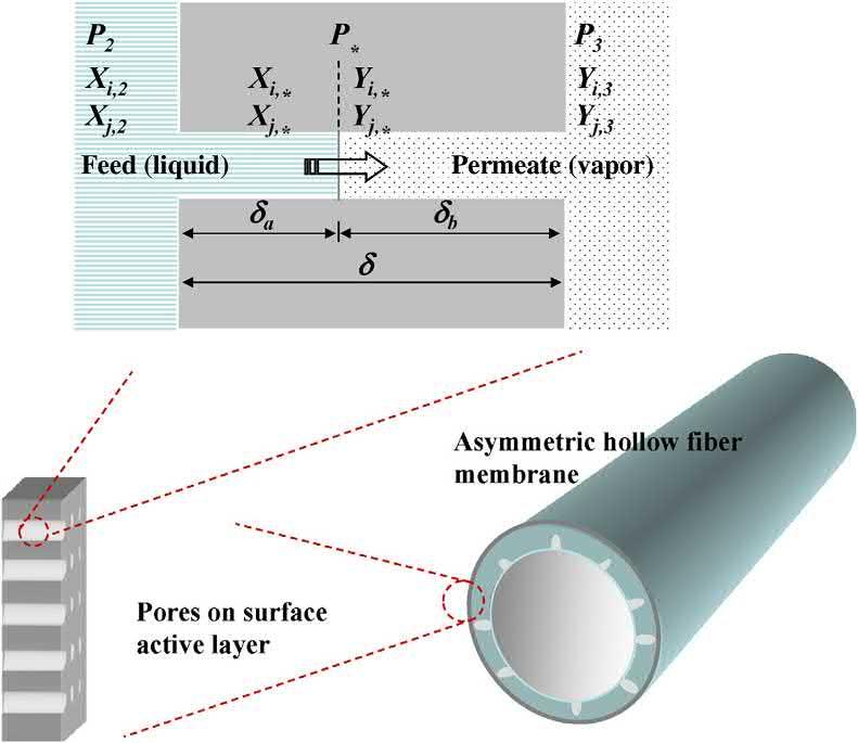 Figure1.2 Schematic representationofthepore-flow modelinpervaporation transportwithinasymmetric hollowfibermembranes.