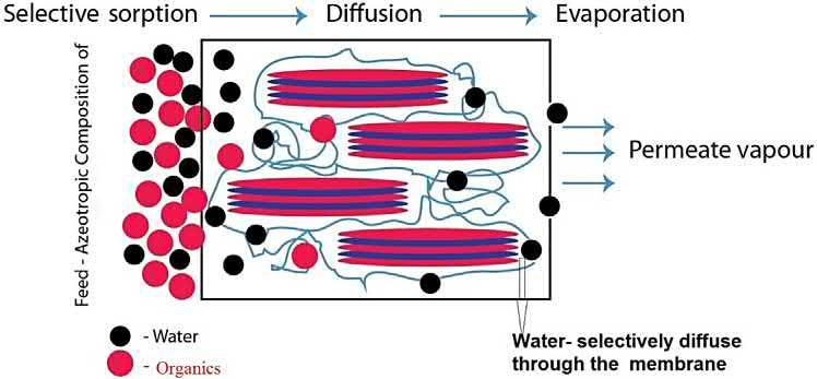 (Fig.1.1) [15].Thephysicochemicalinteractionsofthemembranematerialsandthepermeatingmoleculesplayavitalrole inPVseparation.Sorptionselectivityand/ordiffusionselectivity ofthepermeatingmoleculesarethekeyfactorsthataffectsPV performances.Thepermeatingmoleculeswhichhavemore interactionwiththemembranefavorssorptionselectivityandis basicallyidentifiedbythesolubilityparameterofthemembrane andthepenetrants.