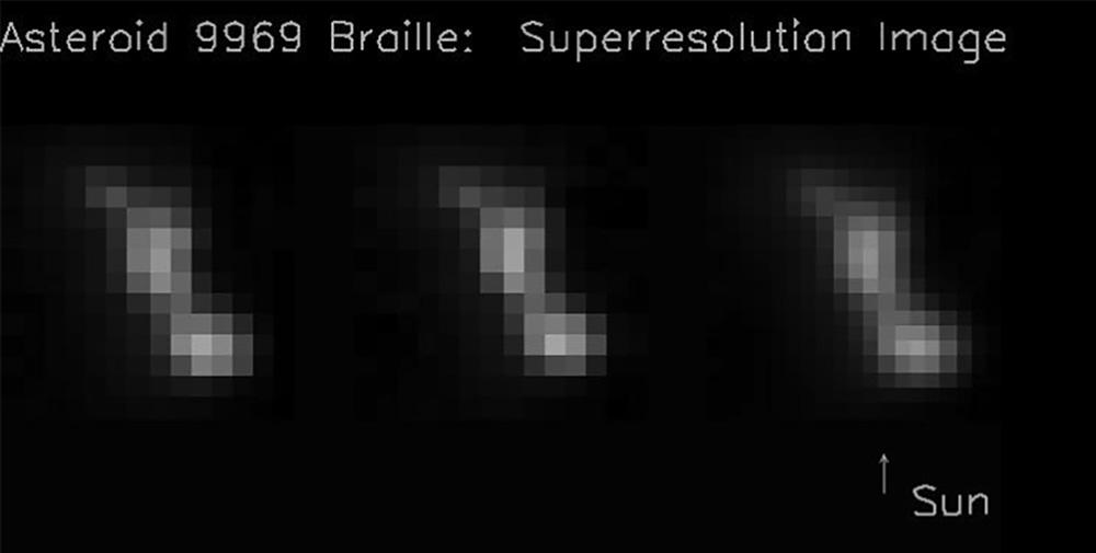FIGURE1.6 ImagesofBraille(leftandcenter)andsuperresolutioncombinationofthetwo(right)takenbythe MiniatureIntegratedCameraandImagingSpectrometerinstrumentonDeepSpace1. ImagecourtesyofNASA/JPLCaltech.