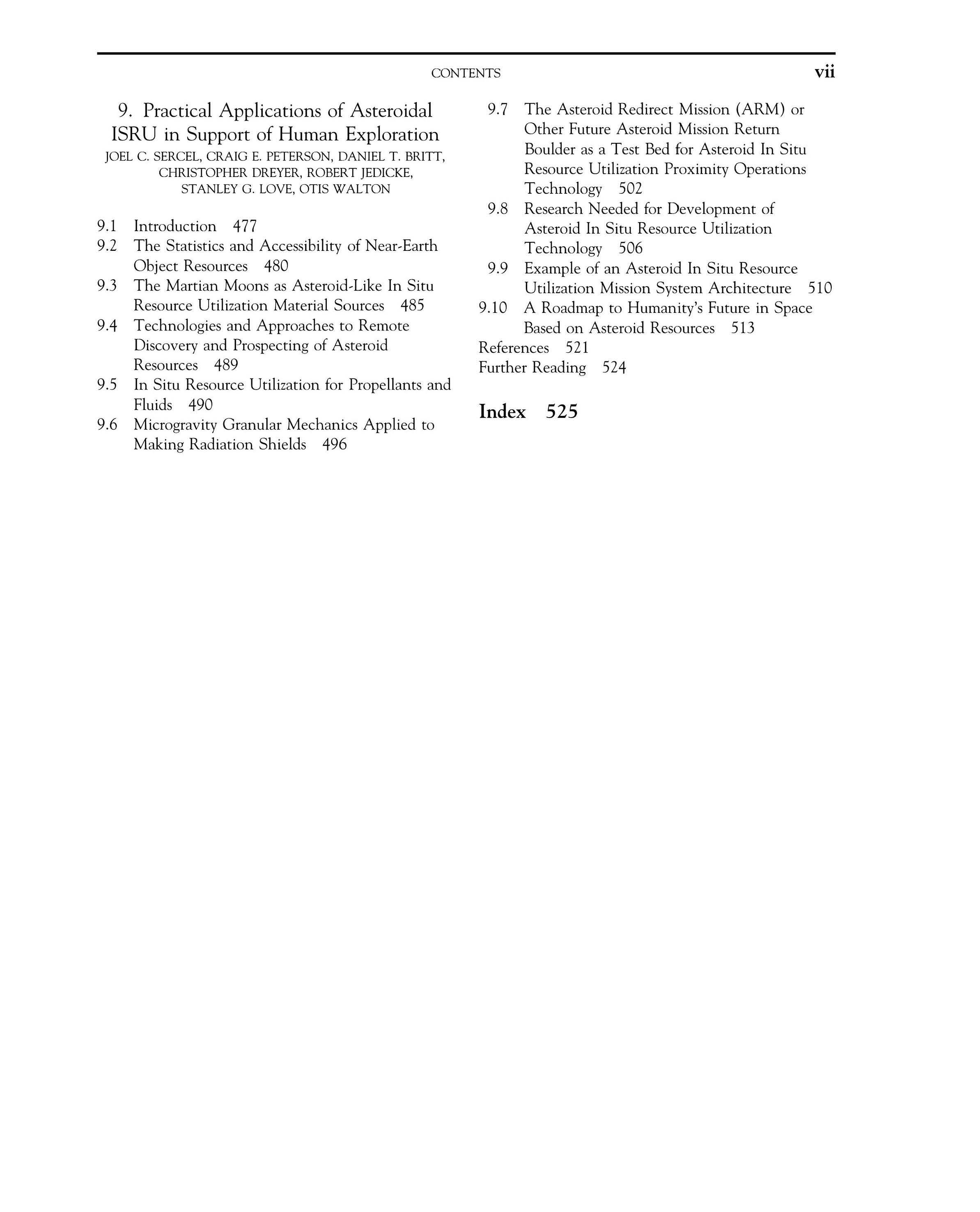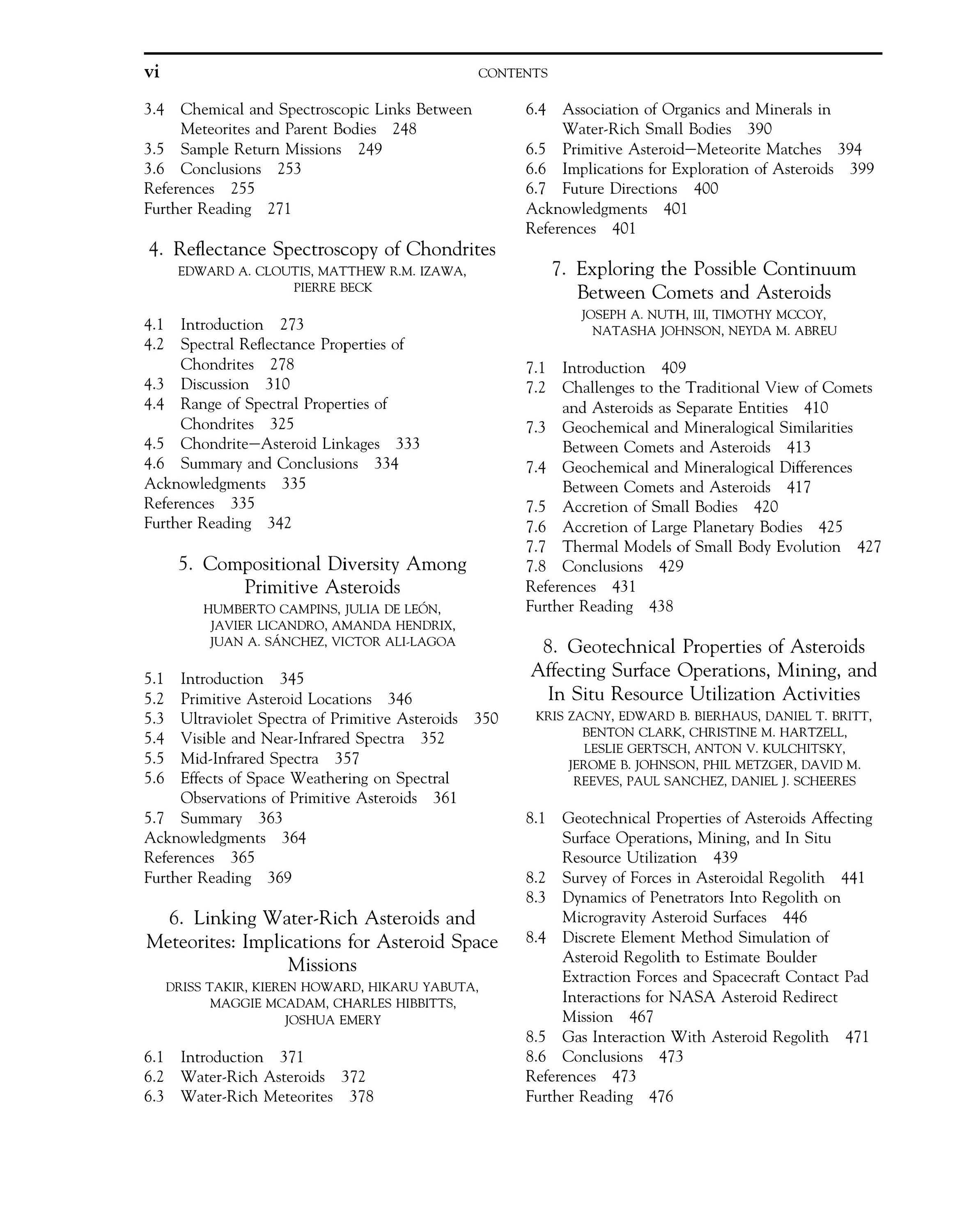 Acknowledgments PrimitiveAsteroidsandMeteoriteswas bornasacollaborationamongmembersof NASA’sAsteroidRedirectMission(ARM) FormulationAssessmentandSupportTeam (FAST).Assuch,weownagreatdebtof gratitudetoDanielD.MazanekandDavid M.ReevesatNASA’sLangleyResearch Center,toPaulA.AbellattheJohnsonSpace Center,toMicheleGatesatNASAHeadquarters,andtocountlessotherswho workedindevelopingthismission.Inmany ways,ARMallowedforasteroidexploration andminingtomoveintothetangiblerealm. ARMbroughttogetheradiverseandvery passionategroupofscientistsandengineers whohavemadethestudyofmeteorites,asteroids,andhowtogetusthereintotheir lives’ work.Mostoftheleadingauthorsin thisvolume’schaptersareformermembers oftheARMFAST.Thepresentworkisan efforttointegrate findingsrelevanttoeachof ourcommunitiestothegoalofexploration, withaparticularemphasisonwater-rich asteroids.