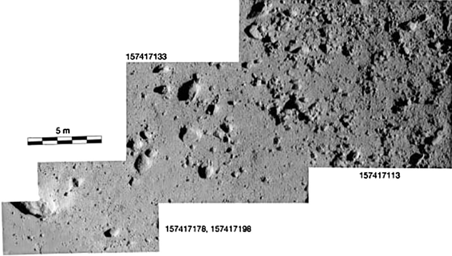 OnFebruary12,2001,whenNEAR-Shoemakerhadsuccessfullycompleteditsyearof investigating433Erosfromorbit,themissionendedwithagentlecontrolleddescentof thespacecraftdowntothesurfaceof433Eros,returningextremelyhighspatialresolution imagesuptothelastmomentofpossiblecontactwiththeEarth(Veverkaetal.,2001).In all,70descentimageswereobtained.Thepictureswereobtainedwhenthespacecraftwas ascloseas120m,revealingfeaturesassmallas1cmacross.Descentimagemosaicsreveal alandingareawithveryfewsmallcratersandanabundanceofejectablocks(someboulders mayshowevidenceoffracturing seethemosaicofthelastfourimagesin Fig.1.10).