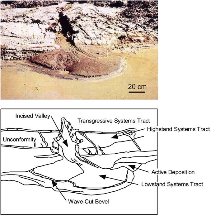 FIGURE1.12 EastCouleeDelta(fromPosamentieretal.,1992a;imagecourtesyofHenry Posamentier),demonstratingtheapplicabilityof sequencestratigraphicconceptsatvirtuallyany scale.Inthisexample,thehighstandsystems tractwasincisedduringthefallinthewater level(pondevaporation),followedbytheprogradationofthelowerelevationlowstanddelta. SeePosamentieretal.(1992a)foramoredetailed interpretation.