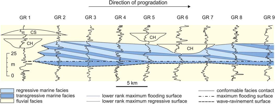 FIGURE1.11 Stratigraphicarchitectureofashallow-watersystem(LateCretaceous,Alberta,Canada).Followingthetransgressionofthe seaway,thelong-termregressionispunctuatedbyhigherfrequencystagesofprogradationandretrogradationwhichdelineateclinoforms separatedbytransgressiveshales.Thisisanexampleofpetroleumreservoircompartmentalizationataproductiondevelopmentscale,inwhich eachclinoformisaseparatehydrodynamicunit.Abbreviations:GR gamma-raylog;CH fluvialchannelfill;CS fluvialcrevassesplay.