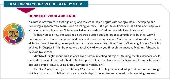 This chapter provides an overview of the audience-centered speaking process, jumpstarting the speechmaking process for students who are assigned to present speeches early in the term. To better streamline the chapter and reduce repetitive topics, we’ve reduced the number of sections from nine to two. Additional coverage has been added on considering the culturally diverse backgrounds of your audience. New research on the importance of speech rehearsal has also been included.