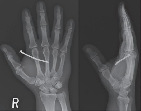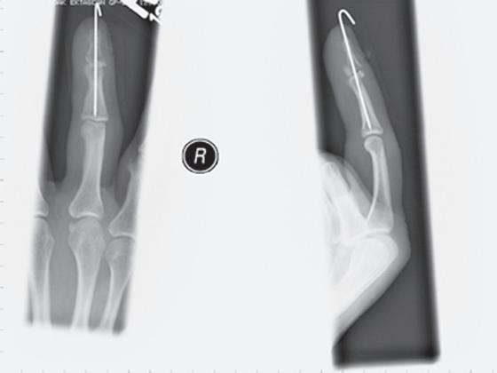 FIGURE 1.37 PA and lateral hand projections to identify location of foreign body (nail).