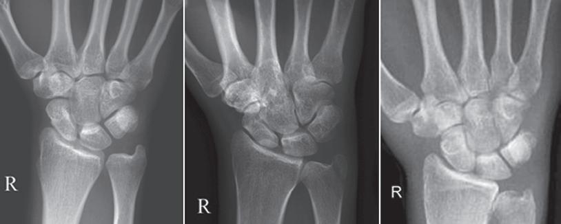 two, and observe how the carpometacarpal joints and distal carpal bones are well visualized on the first PA wrist projection but are not seen on the other two projections. The first lateral wrist projection was obtained with the thumb depressed until the first metacarpal (MC) was aligned with the second MC, whereas the other lateral wrist projections were obtained with the first MC elevated. The first PA wrist projection was obtained with the MCs aligned at a 10- to 15-degree angle with the IR, the second PA wrist projection was taken with the MCs aligned at an angle greater than 15 degrees, and the third projection was taken with the MCs aligned at an angle less than 10 degrees. If the radiologist cannot arrive at a conclusive diagnosis from the projections that the technologist provides, he or she must recommend other imaging procedures or follow-up projections.