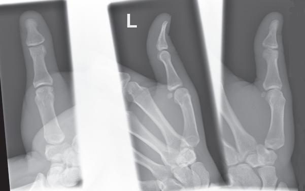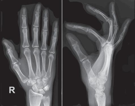 FIGURE 1.4 PA wrist projections demonstrating the difference in carpometacarpal (CMC) joint visualization with variations in metacarpal alignment with the IR.