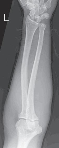 FIGURE 1.24 Proper “to skin line” collimation on an AP forearm projection.