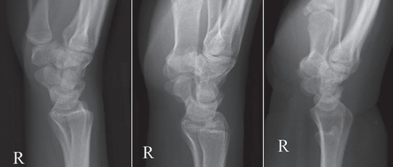 FIGURE 1.38 Lateral and PA wrist projection to demonstrate distal forearm fracture alignment.