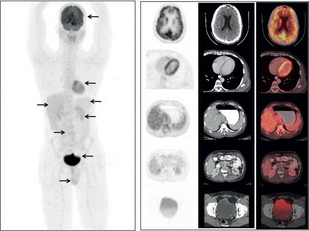 Like glucose, it undergoes phosphorylation to form FDG-6phosphate; however, unlike glucose, it does not undergo further metabolism. At the same time, expression of the enzyme glucose-6-phosphatase is usually significantly decreased in the malignant cells, and FDG-6-phosphate thus undergoes only minimal dephosphorylation, hence becoming “metabolically trapped” in cancer cells [8]. The distribution of FDG in normal organs and pathological lesions is detected by PET scanners.