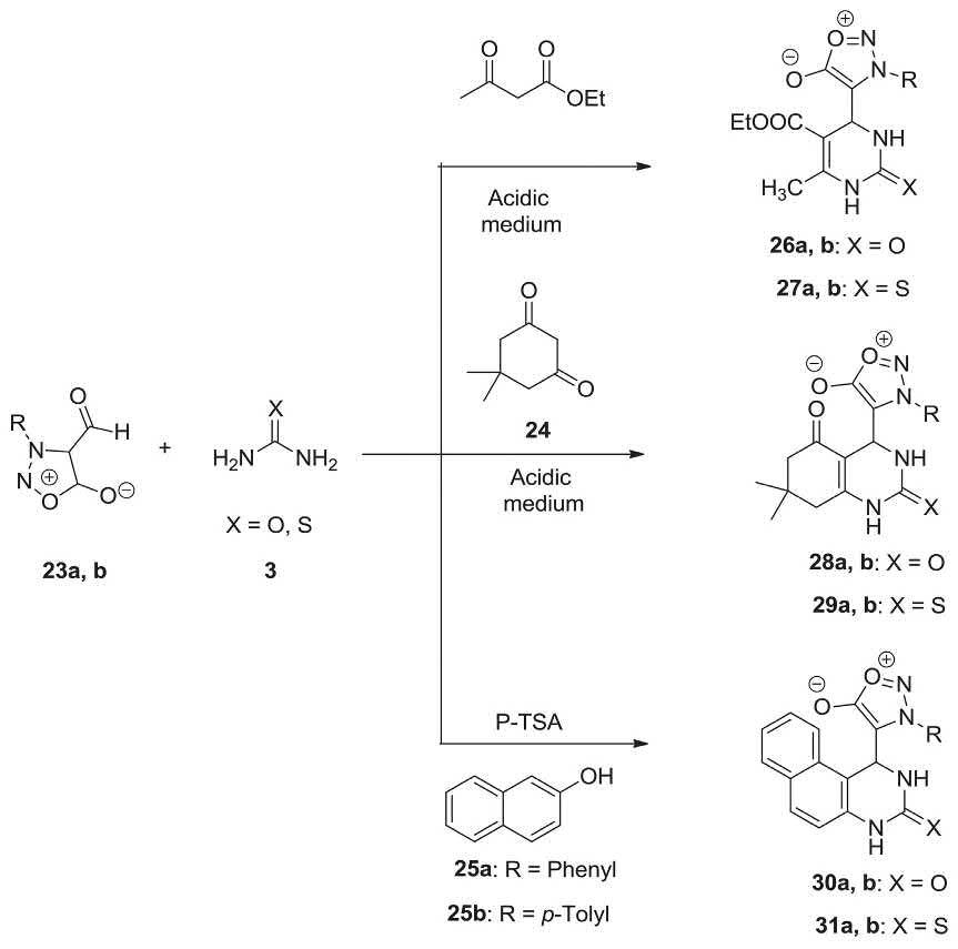 Several aminazolene-2,5-diones 28a, b, 29a, and b were prepared in high yields via Biginelli MCR, involving condensation of compound 23a and 23b, dimedone and urea/thiourea in an acidic medium. The synthesis of naphthalene derivatives 30a, b, 31a, and 23b in satisfactory yields was also achieved by Biginelli MCR of compound 23a and 23b with β-naphthol and urea/thiourea catalyzed by PTSA. Biginelli compounds 26-27a and b and Biginelli-like compounds 28-31a and b were also prepared similarly by using 3-aryl-4-formylsydnone 23a and 23b as a component in Biginelli MCR [206]. 3-Aryl-4-formylsydnone 23a and 23b was provided by formylation of 3-arylsydnone utilizing N-methylformanilide in POCl3 [207]. This reported work involves three sets of reactions for efficient synthesis of dihydropyrimidines 26a, b, 27a, and b via Biginelli MCR (Scheme 2.8).