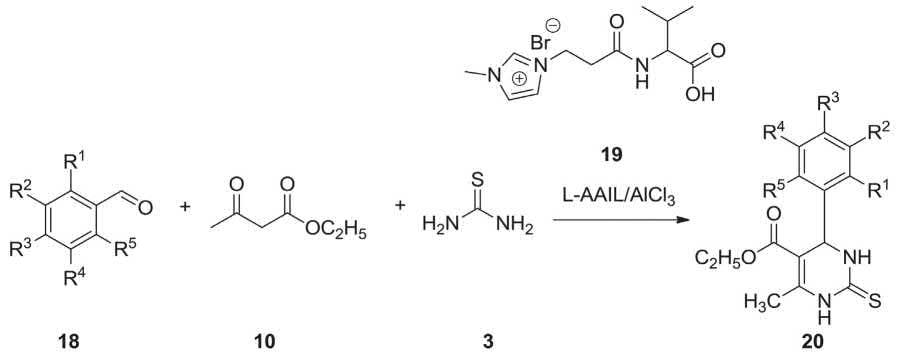 SCHEME 2.6 Synthesis of 3,4-dihydropyrimidin-2(1H)-thiones 20 using L-AAIL/ALCl3 via Biginelli MCR.