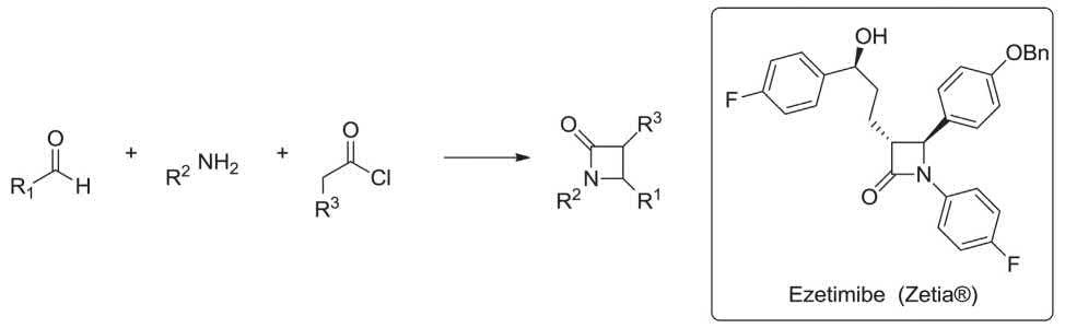 Ezetmibe (Zeta®) is a lipid-lowering compound which selectively inhibits the intestinal absorption of cholesterol. It is prepared via multi-step synthesis by employing the Staudinger-MCR as a vital step. The imine generated from p-fluoroaniline and benzyloxybenzaldehyde was reacted with methyl 5-chloro-5-oxopentanoate mediated by tributylamine in toluene to construct the β-lactam ring. This reaction includes the generation of an intermediate ketene which is subjected to a [2 + 2] cycloaddition reaction with the imine to construct the β-lactam ring, regioselectively, affording the trans isomer as the chief product (Scheme 1.11) [123–125].