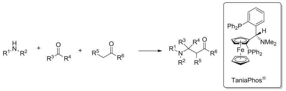 Commercially available TaniaPhos® is a chiral ligand which is used as chiral catalyst in the asymmetric hydrogenation in the Mannich three-component reaction. TaniaPhos® Ligand in turn has been asymmetrically synthesized from the (R)-Ugi amine in two steps. Interestingly, the (R)-Ugi amine itself can be synthesized via a Mannich MCR, involving ferrocene, dimethyl amine and acetaldehyde (Scheme 1.2) [10,67–71]