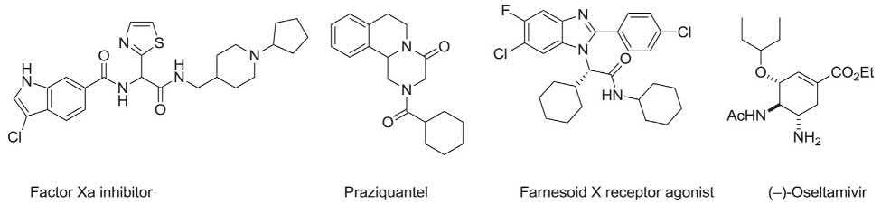 This is particularly striking for the pharmaceutical research centers and industries, in which the facile formation of large libraries of compounds with possible biological activity is a priority and importance. The implication of these processes can be vividly witnessed in a plethora of publications being found when “MCRs” as key word is searched in the chemical literature, especially over the last decade. The screened biological efficacy of compounds synthesized via MCRs has also been established by discovery of several molecules with significant biological potency (Fig. 1.1) [40–44].