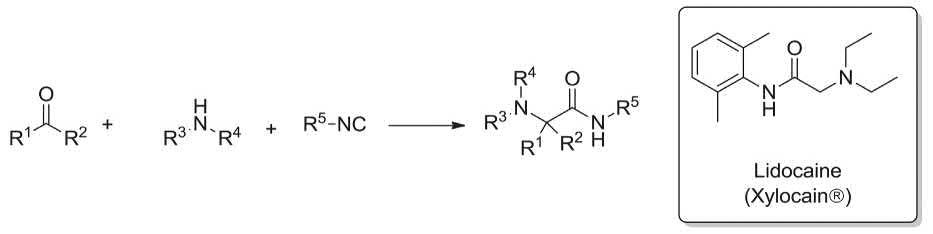 Lidocaine (Xylocain®) is a very common strong local anesthetic. It was synthesized via the Ugi three-component reaction involving, formaldehyde, diethyl amine and 2,6-dimethyl-phenylisocyanide. As a matter of fact this strategy for the synthesis of Lidocaine (Xylocain®) as a prescribed drug, isonitrile-based multicomponent reaction (IMCR) (Scheme 1.5) [115]