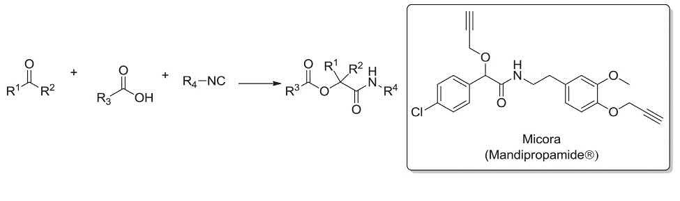 The Passerini reaction affords the fungicidal compound Mandipropamid in just two steps. Initially, the Passerini reaction of an in situ provided isocyanide, an aldehyde and a carboxylic acid gave the corresponding α-acyloxycarboxamide. Next, the latter was alkylated by propargyl bromide to afford Micora (Mandipropamid®) (Scheme 1.4) [111–114]