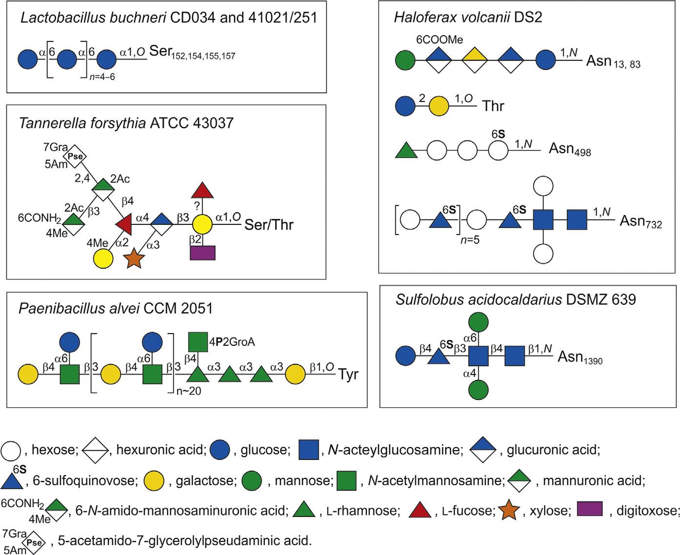 Fig. 2 Schematic depiction of selected S-layer glycan structures from bacteria (left) and archaea (right) to illustrate the diversity of prokaryotic protein-bound glycans. Abbreviations: Ac, CH3CO; CONH2, amidyl-; Me, CH3 . Monosaccharide symbols according to the Symbol Nomenclature for Glycans (SNFG)47. Lb. buchneri, 45,46 Ta. forsythia, 48,49 Pa. alvei, 50,51 Hfx. volcanii, 52–56 and Su. acidocaldarius. 57