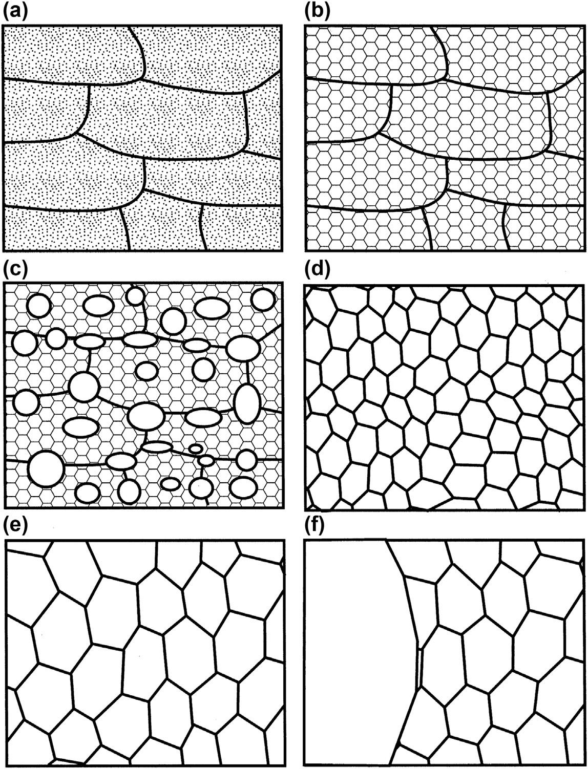 Schematicdiagramofthemainannealingprocesses.(a)Deformedstate;(b)recovered; (c)partiallyrecrystallized;(d)fullyrecrystallized;(e)graingrowth;and(f)abnormalgrain growth.