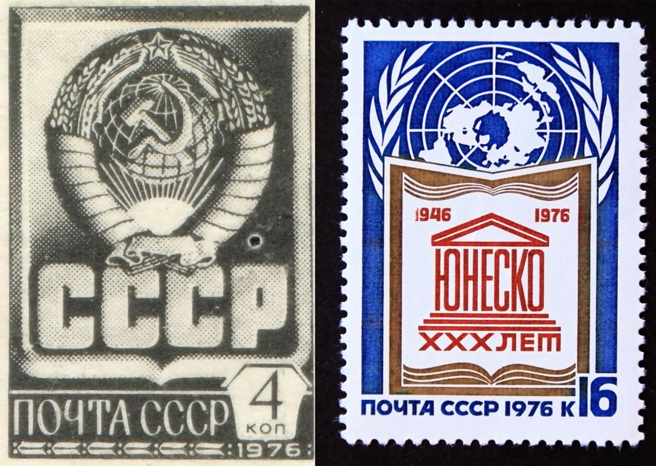 Figure I.1 These two Soviet stamps from 1976 depict the symbolic imagery of the USSR (left) and UNESCO (right). They reflect how both Soviet and UNESCO internationalisms harbored global aspirations but differed in their self-conceptions as (respectively) disruptor or curator of the established order. Courtesy of Wikimedia Commons and Dreamstime.com. © Bob Suir.