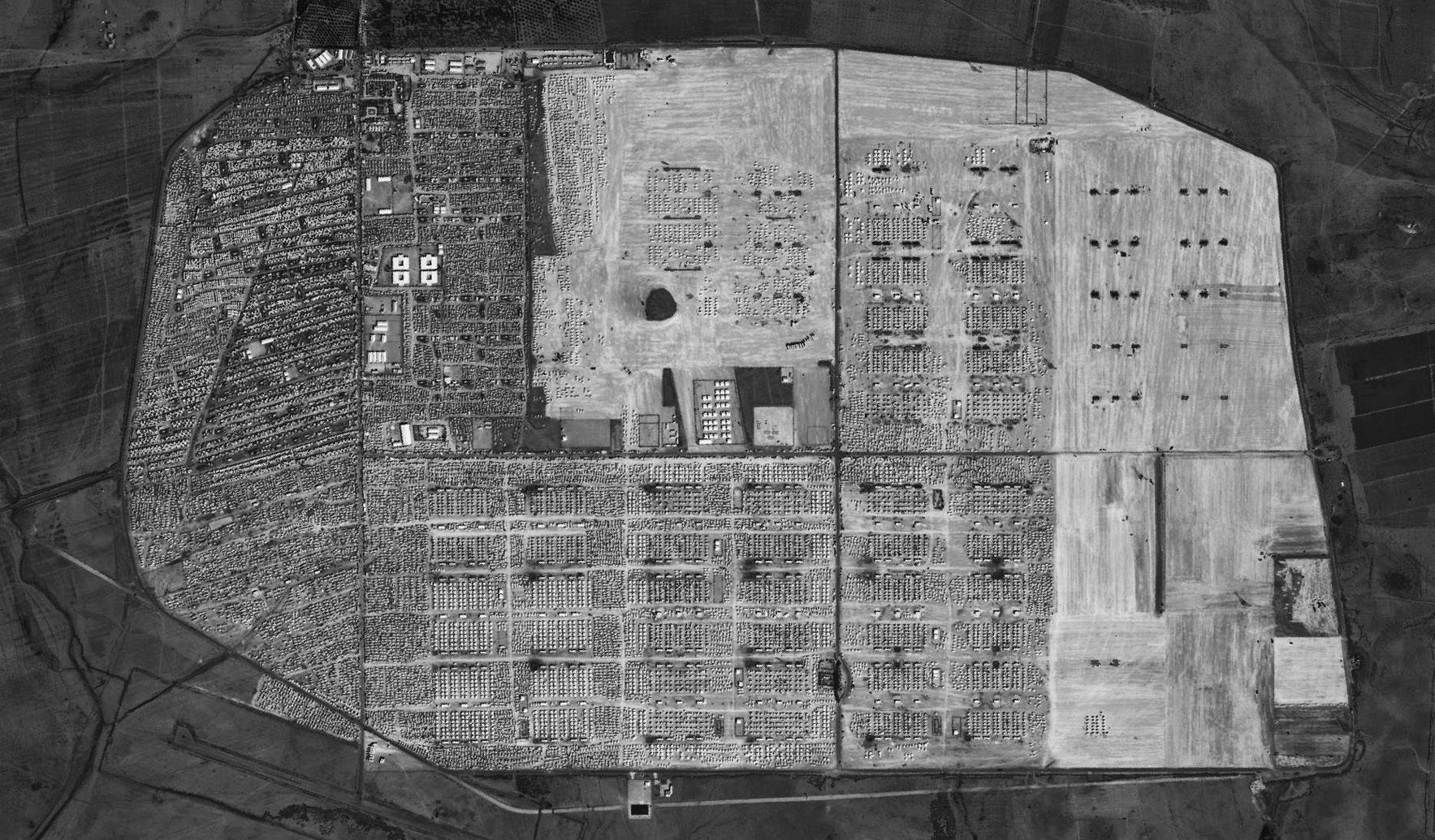 Fi G ure 1.2 The Zaatari refugee camp in Jordan, seen in this 2013 satellite image, grew to host nearly 80,000 Syrian refugees by 2018. Camps funded by the rich countries of the Global North are key building blocks in both the architecture of protection, which provides shelter for refugees, and the architecture of repulsion, which cages them far from the Global North. Photo by DigitalGlobe via Getty Images.