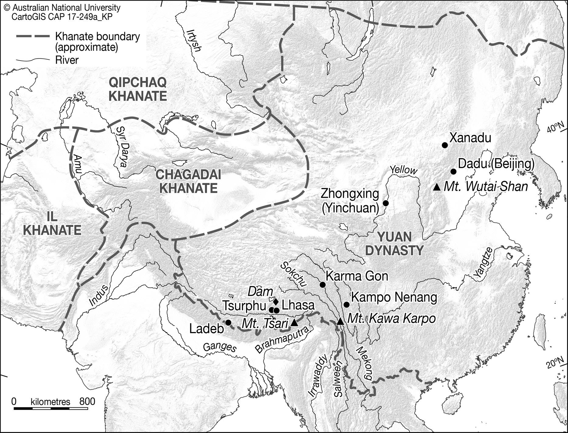 Tibetan names and terms in the book are given in transliterated form using the Tibetan and Himalayan Library’s Simplified Phonetic Transcription of Standard Tibetan system, which was developed by David Germano and Nicolas Tournadre. These words are then listed in the back of the book with romanized Tibetan spellings along with the phonetic pronunciation for each word. Names and terms of Mongolian origin have been transliterated using F. W. Cleaves’s system, with the exception that the q in qan has been written as kh for ease of understanding. All Chinese words have been transliterated using Pinyin.