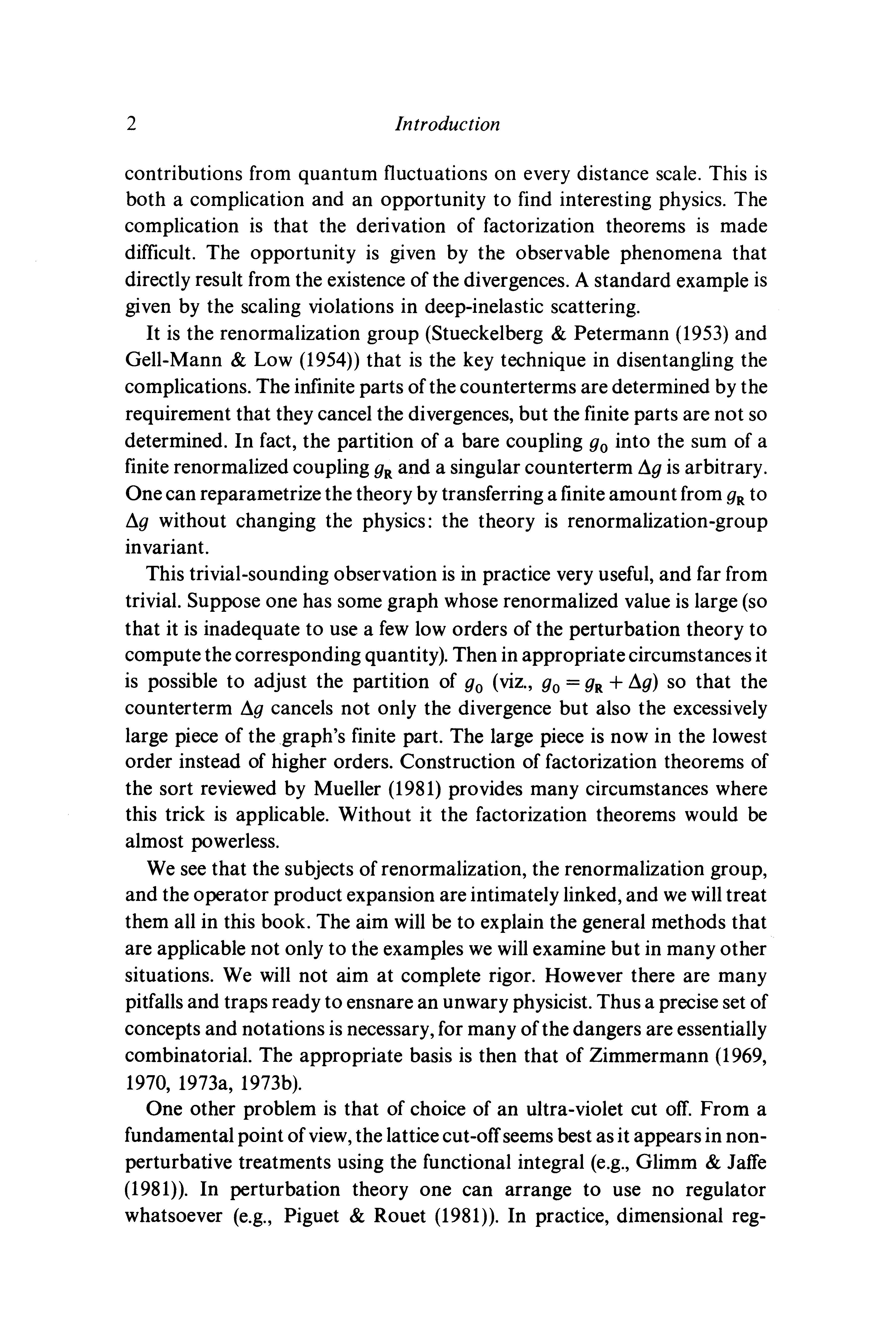 We see that the subjects of renormalization, the renormalization group, and the operator product expansion are intimately linked, and we will treat them all in this book. The aim will be to explain the general methods that are applicable not only to the examples we will examine but in many other situations. We will not aim at complete rigor. However there are many pitfalls and traps ready to ensnare an unwary physicist. Thus a precise set of concepts and notations is necessary, for many of the dangers are essentially combinatorial. The appropriate basis is then that of Zimmermann (1969, 1970, 1973a, 1973b).