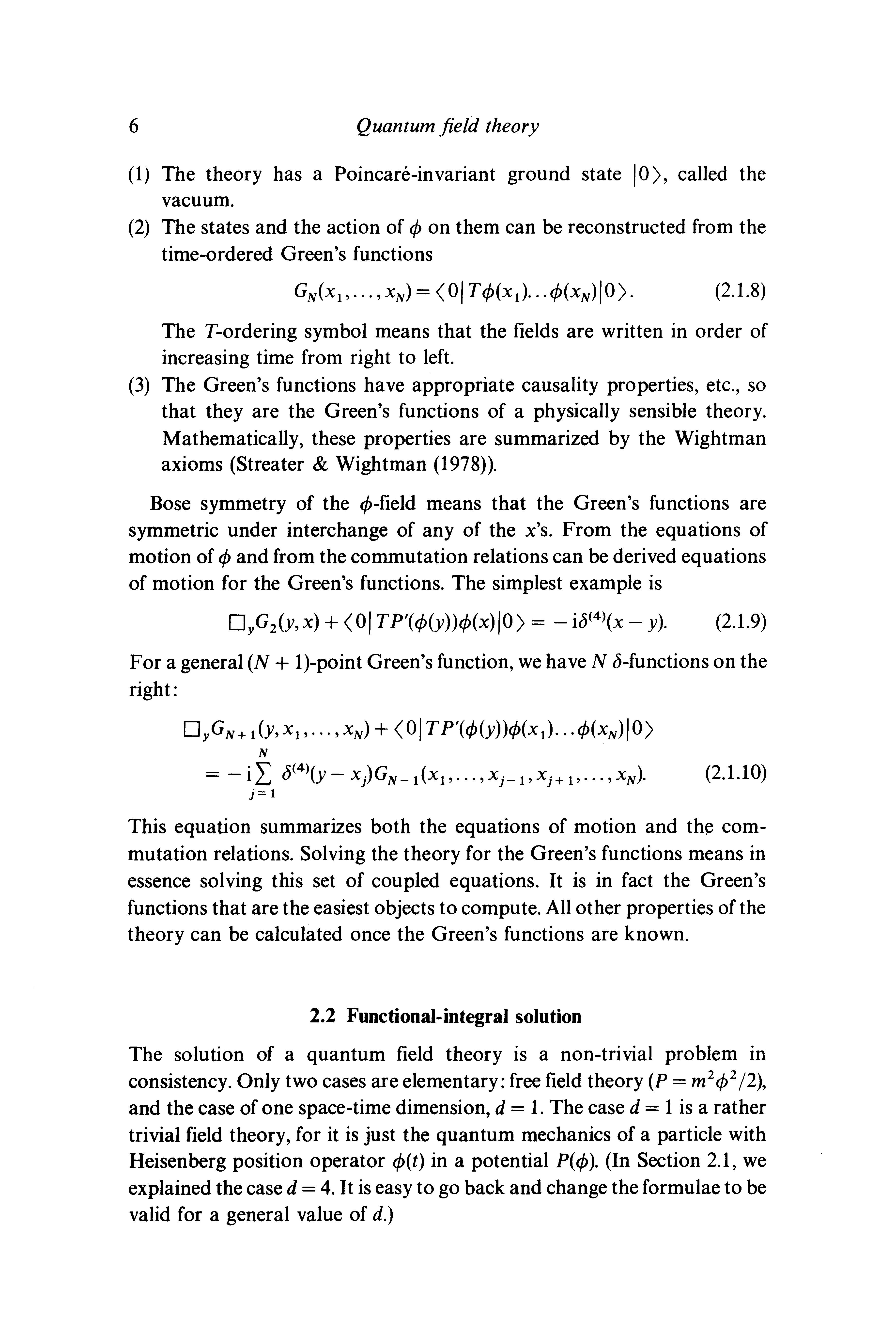 trodynamics (e.g., Oppenheimer (1930)). It is possible to say that the UV divergences mean that the theory makes no physical sense, and that the subject of interacting quantum field theories is full of nonsense (Dirac (1981)). Luckily we can do better, for our ultimate aim need not be to construct a field theory literally satisfying (2.1.2)-(2.1.5). Rather, our aim is to construct a relativistic quantum theory with a local field as its basic observable. These requirements are satisfied if we construct a collection of Green's functions satisfying sensible physical properties (for example, as formulated in the Osterwalder-Schrader axioms- see Glimm & Jaffe (1981)). We may further ask that we find a theory that is close in some sense to satisfying the defining equations (2.1.2)-(2.1.5). Combining the functional integral with suitable renormalizations of the parameters of the theory satisfies these requirements.