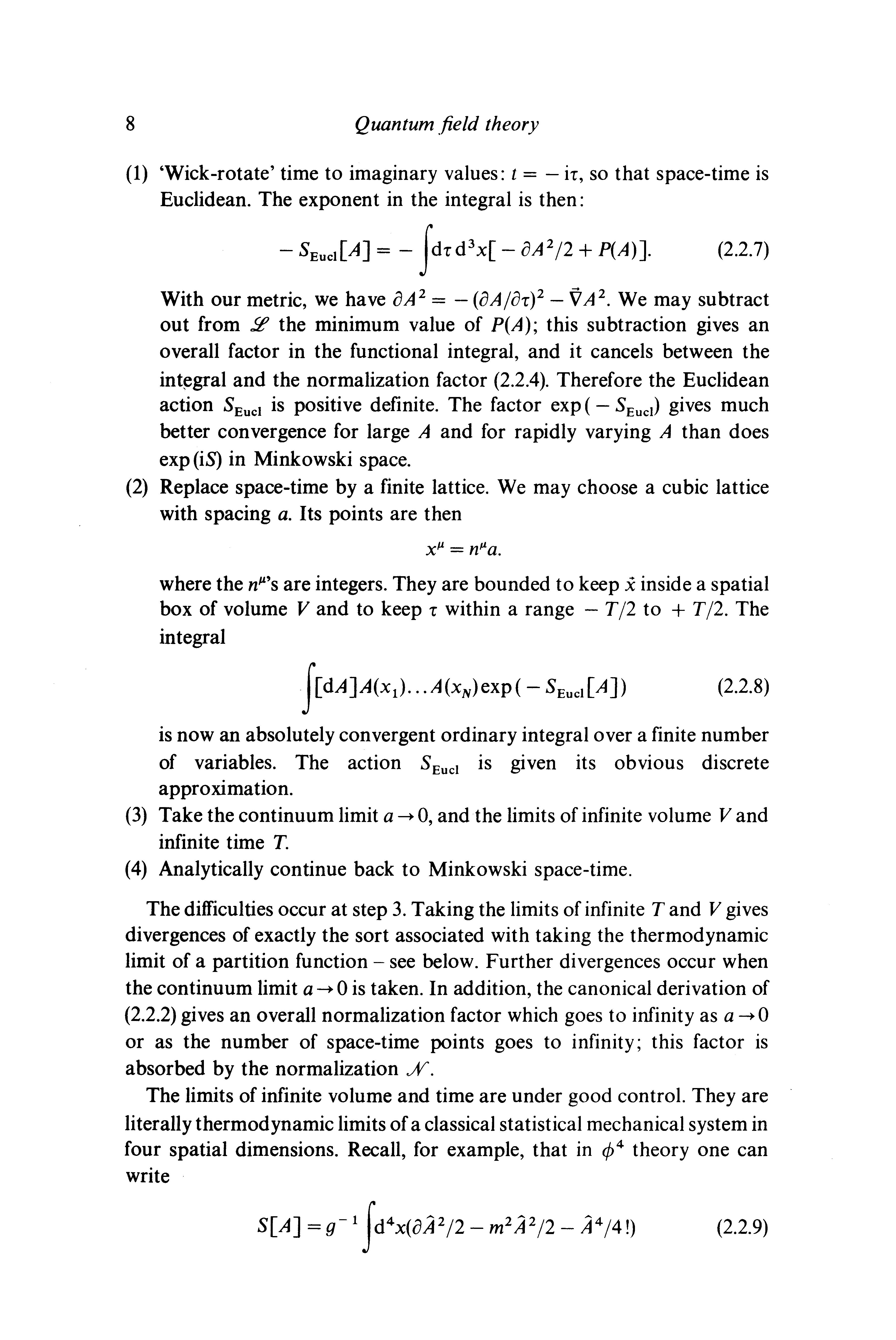 The limits of infinite volume and time are under good control. They are literally thermodynamic limits of a classical statistical mechanical system in four spatial dimensions. Recall, for example, that in ¢ 4 theory one can write (2.2.9)