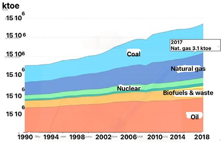 Fossilfuelconsumptionhasincreasedsignificantlyoverthepasthalf-century,around eight-foldsince1950,androughlydoublingsince1980.However,thetypesoffuelwerely onhavealsoshifted,fromsolelycoaltowardacombinationwithoil,andthengas.Today, coalconsumptionisfallinginmanypartsoftheworld.Meanwhile,oilandgasarestillgrowingquickly. BP(2020) givesthefollowingupdatefortheyear2019.