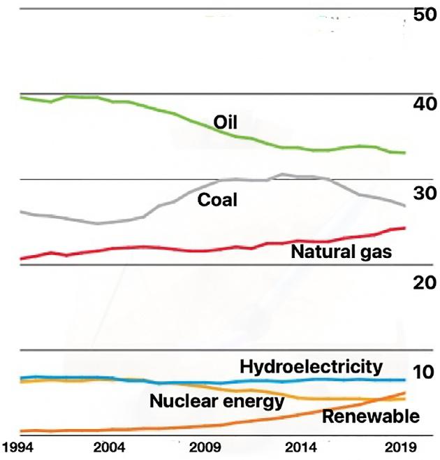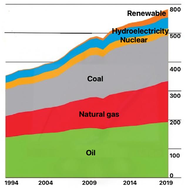 Fig.1.8 showsvariousfractionsofdifferentenergysources.Oilcontinuestoholdthelargestshareoftheenergymix(33.1%).Coalisthesecond-largestfuelbutlostsharein2019to accountfor27.0%,itslowestlevelsince2003.Theshareofbothnaturalgasandrenewables rosetorecordhighsof24.2%and5.0%respectively.Renewableshavenowovertakennuclear