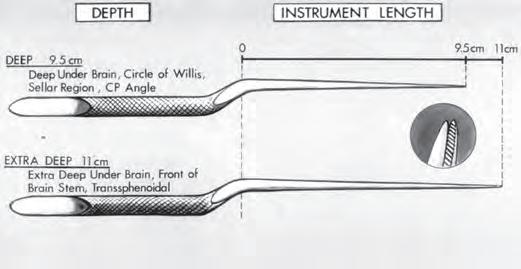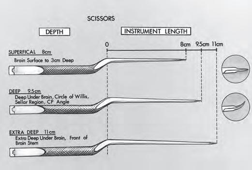 FIGURE1.15. Rhotonbayonetscissorswithstraightandcurvedblades. Thebayonetscissorswith8-cmshaftsareusedatthesurfaceofthebrain anddowntoadepthof3cm.Thescissorswith9.5-cmshaftsareused deepunderthebrain,atthelevelofthecircleofWillis,thesuprasellar area,andthecerebellopontine(CP)angle.Thescissorswith11-cmshafts areusedatextra-deepsites,suchasinfrontofthebrainstem.Thestraight nonbayonetscissorsshownin Figure8 mayalsobeusedatthesurfaceof thebrain.