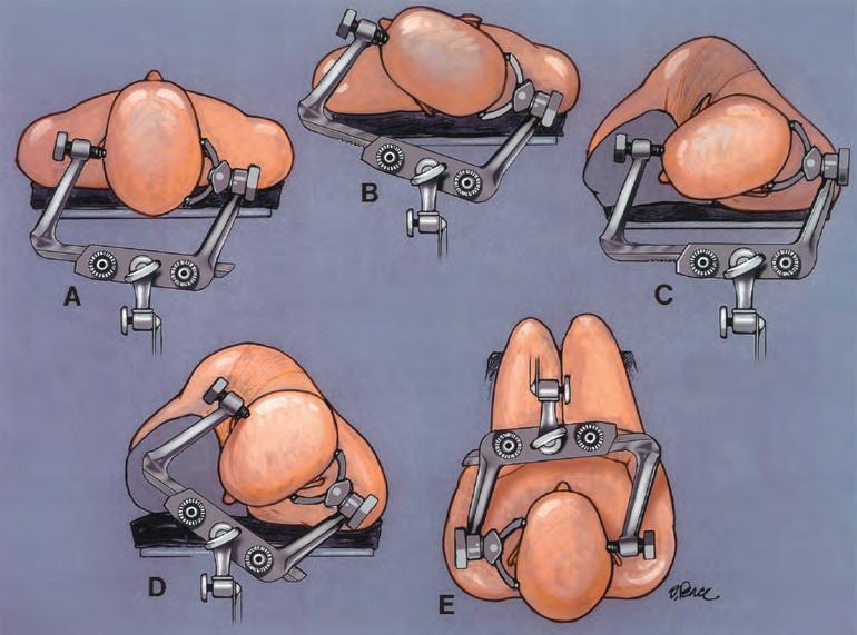 FIGURE1.5. Positioningofapinion headholderforacraniotomy.Threepins penetratethescalpandarefirmlyfixedto theoutertableofthecranium. A,position oftheheadholderforaunilateralorbilateralfrontalapproach. B,positionfora pterionalorfrontotemporalcraniotomy. C,positionforaretrosigmoidapproachto thecerebellopontineangle. D,positionfor amidlinesuboccipitalapproach. E,positionforamidlinesuboccipitalapproach withthepatientinthesemi-sittingposition.Thepinsarepositionedtoavoidthe thinboneoverthefrontalsinusandmastoidaircellsandthetemporalismuscle. Thesidearmsoftheheadclampshouldbe shapedtoaccommodatetheC-clamps holdingtheretractorsystem.Thepinion headholderhasaboltthatresemblesa sunburst,forattachmenttotheoperating table.Placementofthreesunburstsiteson theheadclamp,ratherthanonlyone,allowsgreaterflexibilityinattachingthe headclamptotheoperatingtableandprovidesextrasitesfortheattachmentofretractorsystemsandinstrumentsforinstrumentguidance.