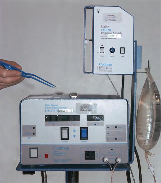 FIGURE1.13. MalisirrigationbipolarcoagulationunitwithcoatedRhotonbayonetcoagulationforceps.Asmallamountoffluidisdispensedat thetipoftheforcepsduringeachcoagulationstep.