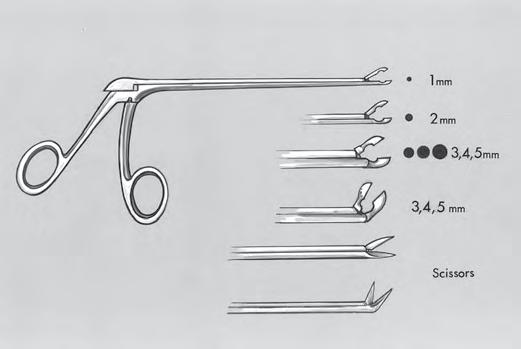 FIGURE1.16. Straightandangledalligatorcupforcepsandscissors. Thesefinecupforcepsareusedtograspandremovetumorsindeepnarrowexposures.A2-,3-,or4-mmcupisrequiredformostmicrosurgical applications,butcupforcepsassmallas1mmoraslargeas5mmare occasionallyneeded.Straightandangledalligatorscissorswiththesame mechanismofactionasthecupforcepsarerequiredfordeepnarrowexposures,asinthedepthsoftranssphenoidalapproaches.