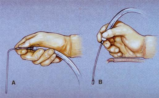 FIGURE1.7. Commonhandgripsforholdingsurgicalinstruments.The gripisdeterminedlargelybythedesignoftheinstrument. A,asuction tubeheldinapistolgrip.Thedisadvantagesofthistypeofgriparethatit usesmovementsofthewristandelbow,ratherthanfinefingermovements,topositionthetipoftheinstrumentandthehandcannotberested andstabilizedonthewoundmargin. B,asuctiontubeheldinapencil grip,whichpermitsmanipulationofthetipwithdelicatefingermovements,whilethehandrestscomfortablyonthewoundmargin.