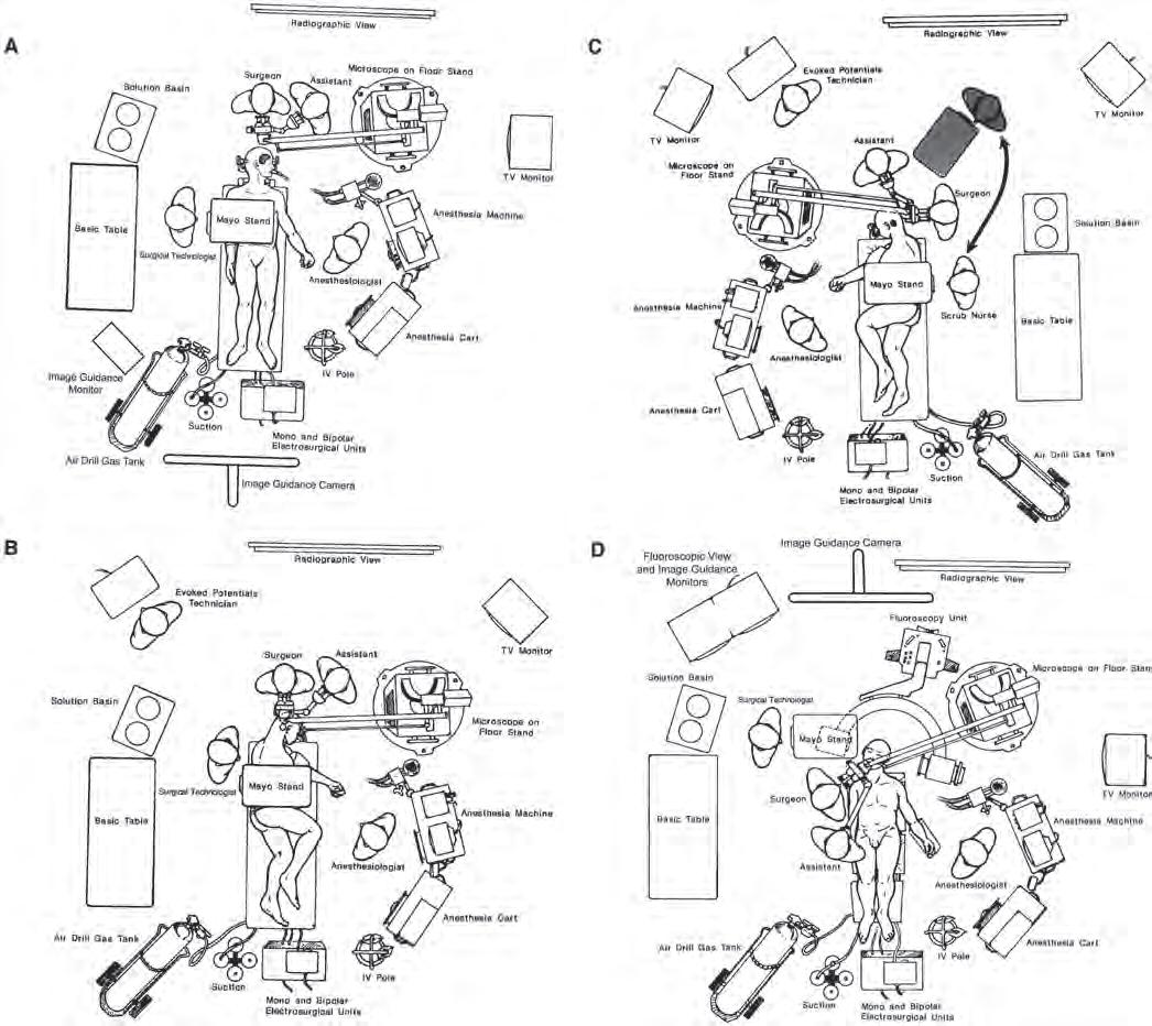FIGURE1.1. Positioningofstaffandequipmentintheoperatingroom. A,positioningforarightfrontotemporalcraniotomy.Theanesthesiologistispositionedon thepatient’sleftside,wherethephysiciancanhaveeasyaccesstotheairway,monitorsonthechest,andtheintravenous(IV)andintra-arteriallines.Themicroscope standispositionedabovetheanesthesiologist.Thescrubnurse,positionedontherightsideofthepatient,passesinstrumentstothesurgeon’srighthand.Theposition isreversedforaleftfrontotemporalcraniotomy,withtheanesthesiologistandmicroscopeonthepatient’srightsideandthenurseontheleftside.Mayostandshave replacedthelargeheavyinstrumenttablespositionedabovethepatient’strunk,whichrestrictedaccesstothepatient.Thesuctionsystem,compressedairtanksforthe drill,andelectrosurgeryunitsarepositionedatthefootofthepatient;thelinesfromtheseunitsareledupneartheMayostand,sothatthenursecanpassthemto thesurgeonasneeded.Atelevision(TV)monitorispositionedsothatthenursecananticipatetheinstrumentneedsofthesurgeon.Theinfraredimageguidancecamera ispositionedsothatthesurgeon,assistants,andequipmentdonotblockthecamera’sviewofthemarkersattheoperativesite. B,positioningforarightsuboccipital craniotomydirectedtotheupperpartoftheposteriorfossa,suchasadecompressionoperationfortreatmentoftrigeminalneuralgia.Thesurgeonisseatedatthehead ofthepatient.Theanesthesiologistandmicroscopearepositionedonthesidethepatientfaces.Theanesthesiologistandnurseshiftsidesforanoperationontheleft side. C,positioningforaleftsuboccipitalcraniotomyforremovalofanacousticneuroma.Thesurgeonisseatedbehindtheheadofthepatient.Forremovalofaleft acoustictumor,thescrubnurse,withtheMayostand,maymoveuptothe shadedarea,whereinstrumentscanbepassedtothesurgeon’srighthand.Forright suboccipitaloperationsorformidlineexposures,thepositionsarereversed,withthescrubnurseandMayostandbeingpositionedabovethebodyofthepatient,which allowsthenursetopassinstrumentstothesurgeon’srighthand.Ineachcase,theanesthesiologistispositionedonthesidetowardwhichthepatientfaces. D,positioning fortranssphenoidalsurgery.Thesurgeonispositionedontherightsideofthepatientandtheanesthesiologistontheleftside.Thepatient’sheadisrotatedslightlyto therightandtiltedtotheleft,toprovidethesurgeonwithaviewdirectlyupthepatient’snose.ThemicroscopestandislocatedjustoutsidetheC-armonthefluoroscopy unit.ThenurseandMayostandarepositionednearthepatient’shead,aboveonearmofthefluoroscopyunit.Theimageguidancecameraispositionedsothatthe surgeondoesnotblockitsviewoftheoperativesite.