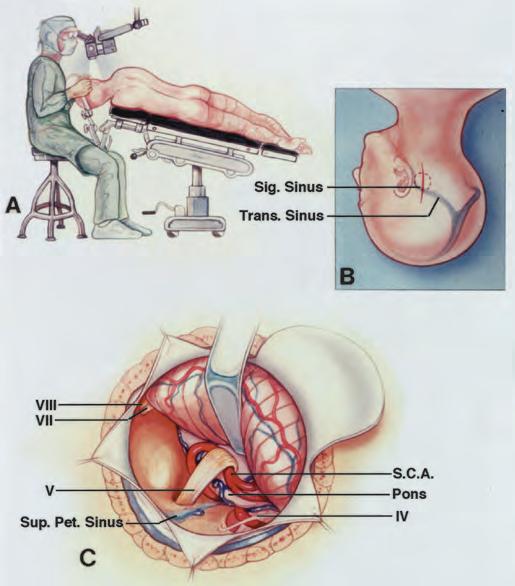 FIGURE1.3. Retrosigmoidapproachtothetrigeminalnerveforadecompression operation. A,thepatientispositionedinthethree-quarterproneposition.The surgeonisattheheadofthetable.Thepatient’sheadisfixedinapinionheadholder. Thetableistiltedtoelevatethehead. B,theverticalparamediansuboccipitalincision crossestheasterion.Asmallcraniotomyflap,ratherthanacraniectomy,isusedfor approachestothecerebellopontineangle.Thesuperolateralmarginofthecraniotomy ispositionedatthelower-edgejunctionofthetransverseandsigmoidsinuses. C,the superolateralmarginofthecerebellumisgentlyelevatedwithataperedbrainspatula, toexposethesiteatwhichthesuperiorcerebellararteryloopsdownintotheaxillaof thetrigeminalnerve.Thebrainspatulaisadvancedparalleltothesuperiorpetrosal sinus.Thetrochlear,facial,andvestibulocochlearnervesareintheexposure.Thedura alongthelateralmarginoftheexposureistackeduptotheadjacentmuscles,to maximizetheexposure.Attheendoftheprocedure,theboneflapisheldinplacewith magneticresonanceimaging-compatibleplates. Pet.,petrosal; S.C.A.,superiorcerebellarartery; Sig.,sigmoid; Sup.,superior; Trans.,transverse(from,RhotonALJr: Microsurgicalanatomyofdecompressionoperationsonthetrigeminalnerve,in RovitRL(ed): TrigeminalNeuralgia.Baltimore,Williams&Wilkins,1990,pp 165–200[9]).