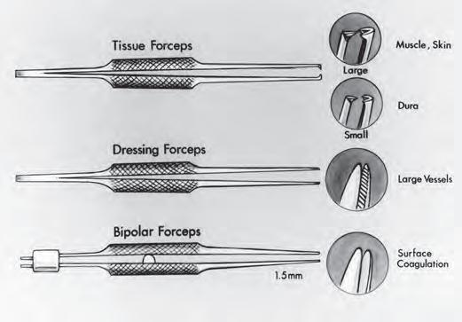Theadditionofround-handlestraightforcepswithteeth, calledtissueforceps,increasestheusesofinstrumentswith roundhandlestoincludegraspingofmuscle,skin,anddura (Fig.1.11).Tissueforcepswithlargeteethareusedforthe scalpandmuscle,andoneswithsmallteethareusedforthe dura.Theadditionofround-handleforcepswithfineserrationsinsidethetips,calleddressingforceps,makestheset suitableforgraspingarterialwallsforendarterectomyand arterialsuturing.
