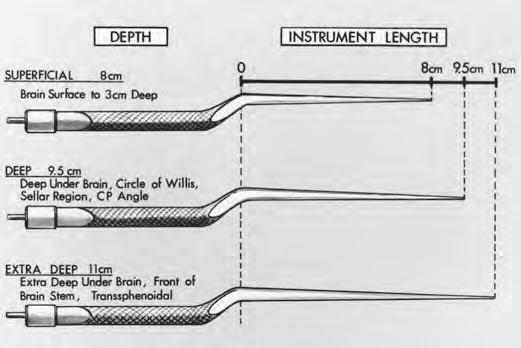 Suctiontubeswithbluntroundedtipsarepreferred.Dandy designedandusedbluntsuctiontubes,andhistraineeshave continuedtousetheDandytypeoftube(Fig.1.28)(16). Yas ¸ argiletal.(19)andRhotonandMerz(16)reportedtheuse ofsuctiontubeswithbluntroundedtips,whichallowedthe tubestobeusedforthemanipulationoftissueaswellasfor suction.Thethickeningandroundingofthetipsreducethe problemofthesmall3-and5-Frenchtubesbecomingsharp whentheyaresmoothlycutatrightanglestotheshaft.Some suctiontubes,suchasthoseofthecurvedAdsontype,become somewhatpointedwhenpreparedinsizesassmallas3or5 French,becausethedistalendofthetubeiscutobliquelywith respecttothelongaxisoftheshaft,makingthetubesless suitableforusenearthethinwallsofaneurysms.