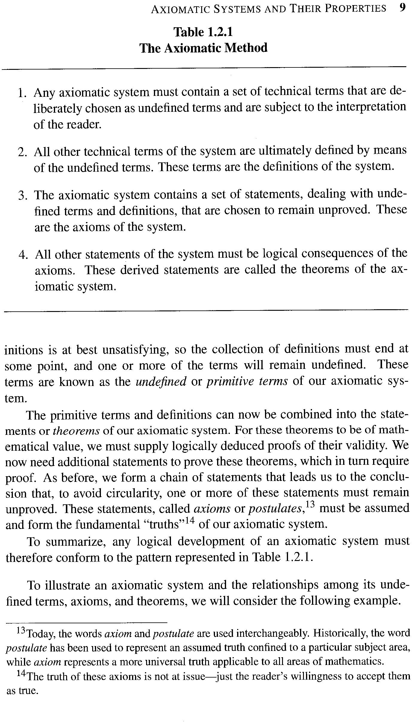 To summarize, any logical development of an axiomatic system must therefore conform to the pattern represented in Table 1.2.1.