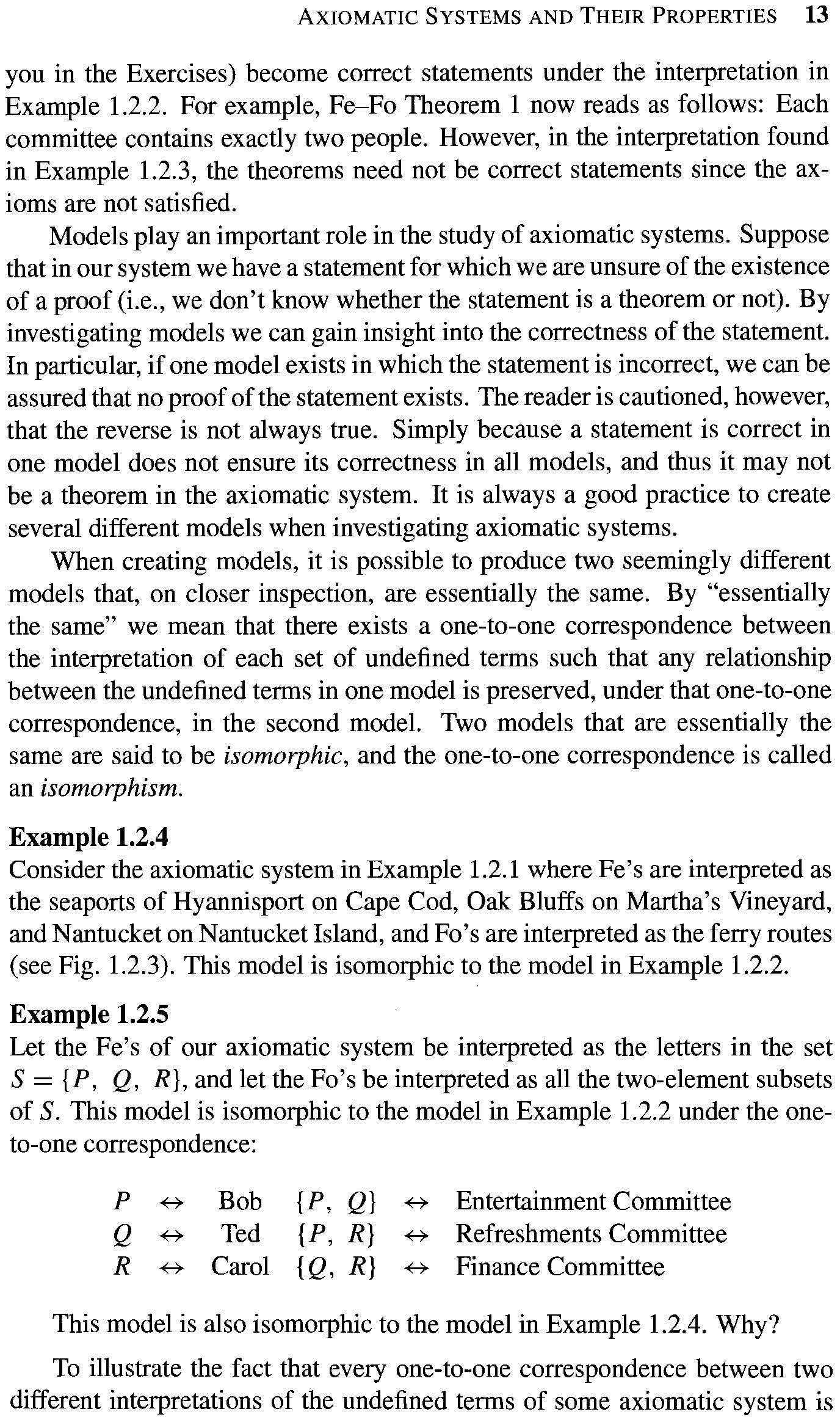 you in the Exercises) become correct statements under the interpretation in Example 1.2.2. For example, Fe-Fo Theorem I now reads as follows: Each committee contains exactly two people. However, in the interpretation found in Example 1.2.3, the theorems need not be correct statements since the axioms are not satisfied.