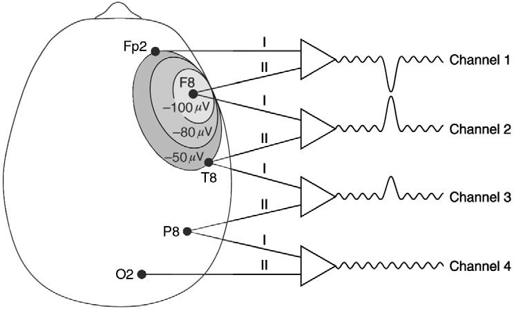 Other channels (e.g., F4–C4 and C4–P4) may be affected by the declining potential field generated at F8. Thus, phase reversals at lower amplitude would be recorded at these sites. Note that these considerations apply to any potential at any point on the scalp.