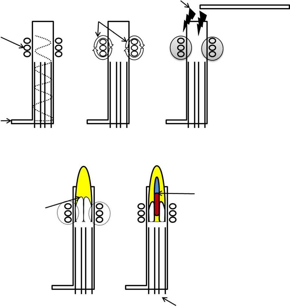 Graphical depiction of the steps in ICP generation: (A) Tangential Ar flow; (B) application of current to load coil to generate electromagnetic field within torch tip; (C) application of voltage spark; (D) collision induced ionization within load coil induction region; (E) formation of ICP discharge. Adapted from C. B. Boss, K. J. Fredeen. Concepts, Instrumentation and Techniques in Inductively Coupled Plasma Optical Emission Spectrometry. Norwalk, CT, USA: Perkin-Elmer Corporation, (1997).
