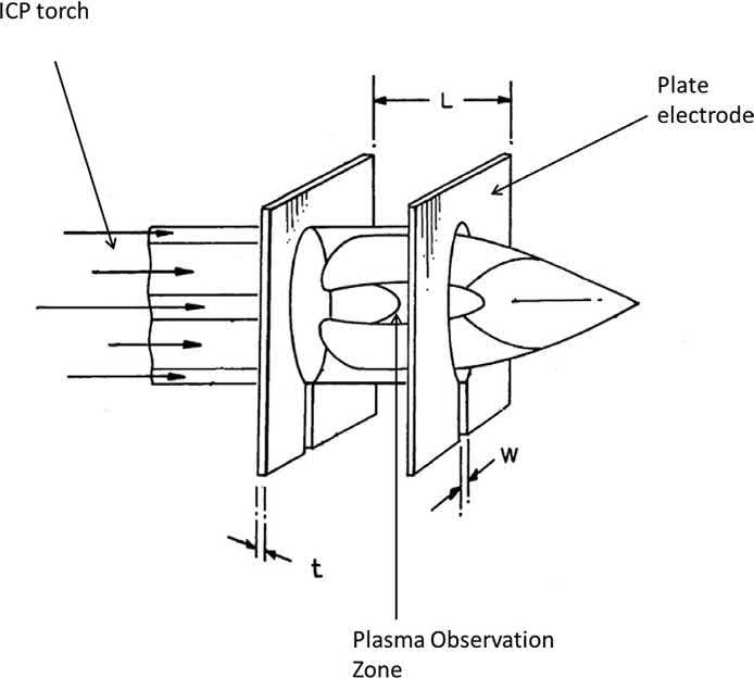 coils of traditional ICP instruments. This allows for a robust, flat-bottom ICP to be generated and sustained using approximately half the Ar gas consumption of traditional helical-coil induction systems. In addition, the RF power and frequency supplied to each electrode plate can be independently controlled and varied for optimal plasma excitation and emission [16].