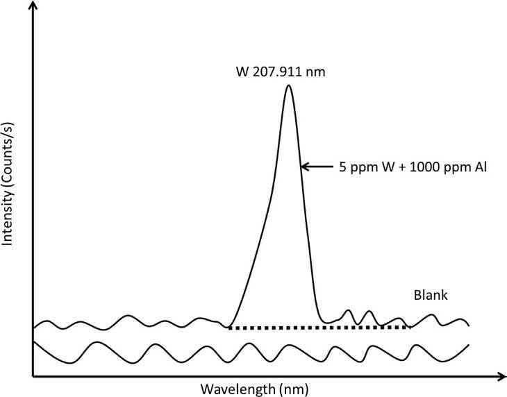 Single-point background correction for the simple background shift from 1000 mg/L Al on the W 207.911 nm line. Adapted from C. B. Boss, K. J. Fredeen. Concepts, Instrumentation and Techniques in Inductively Coupled Plasma Optical Emission Spectrometry. Norwalk, CT, USA: Perkin-Elmer Corporation, (1997).