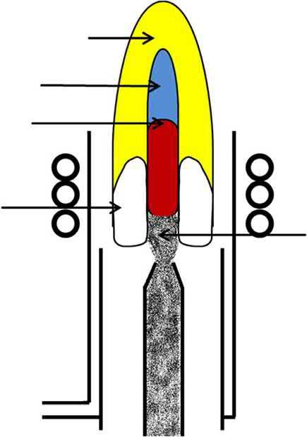 Several regions exist in the ICP (Fig. 1.5) [18,19]. The toroidal (doughnut-shaped) base of the plasma, from the sample aerosol punching a hole in its center, is the induction region, with a temperature of around 10,000 K. The induction region is where energy is transferred from the load coil to the plasma via the inductive coupling process. As the sample aerosol is introduced into the ICP torch injector channel, via the central gas flow (i.e., nebulizer or carrier gas), the desolvation, vaporization and atomization processes will occur in the preheating zone. Desolvation serves to remove the solvent from the sample aerosol droplets, resulting in microscopic solid particles [3]. The sample particles are vaporized into gas phase molecules and then broken into atoms during the vaporization and atomization steps, respectively. Excitation and ionization of the resulting sample atoms occur in the initial radiation zone (IRZ) and normal analytical zone (NAZ), respectively, which are at a temperature of 6000–8000 K. The emitted light from excited atoms and/or ions is collected by the plasma