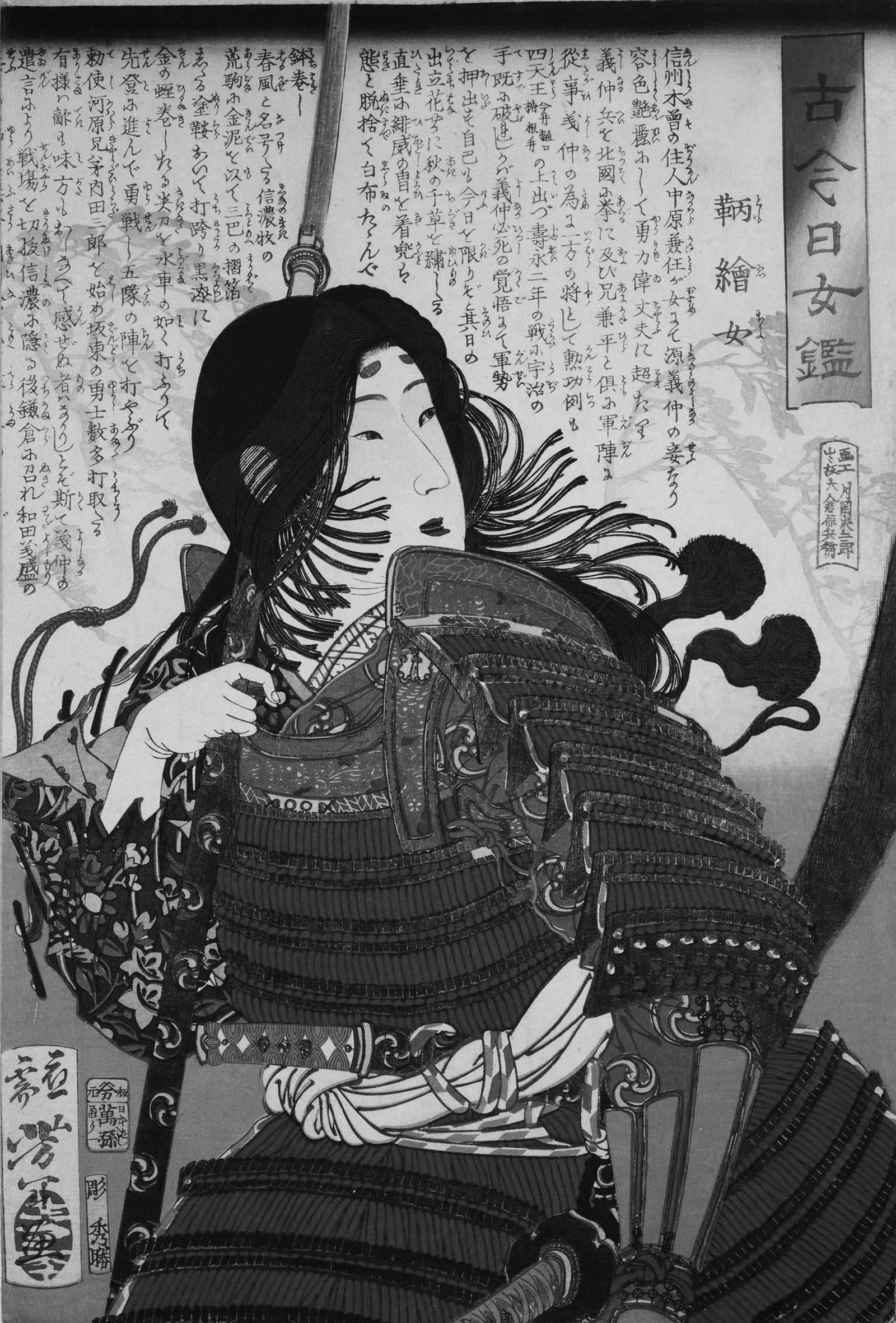 Tomoe Gozen is shown dressed in armor—depicted as a combatant rather than as a docile wife. The artist describes her “wielding her halberd like a water wheel.” British Museum, AN433673001